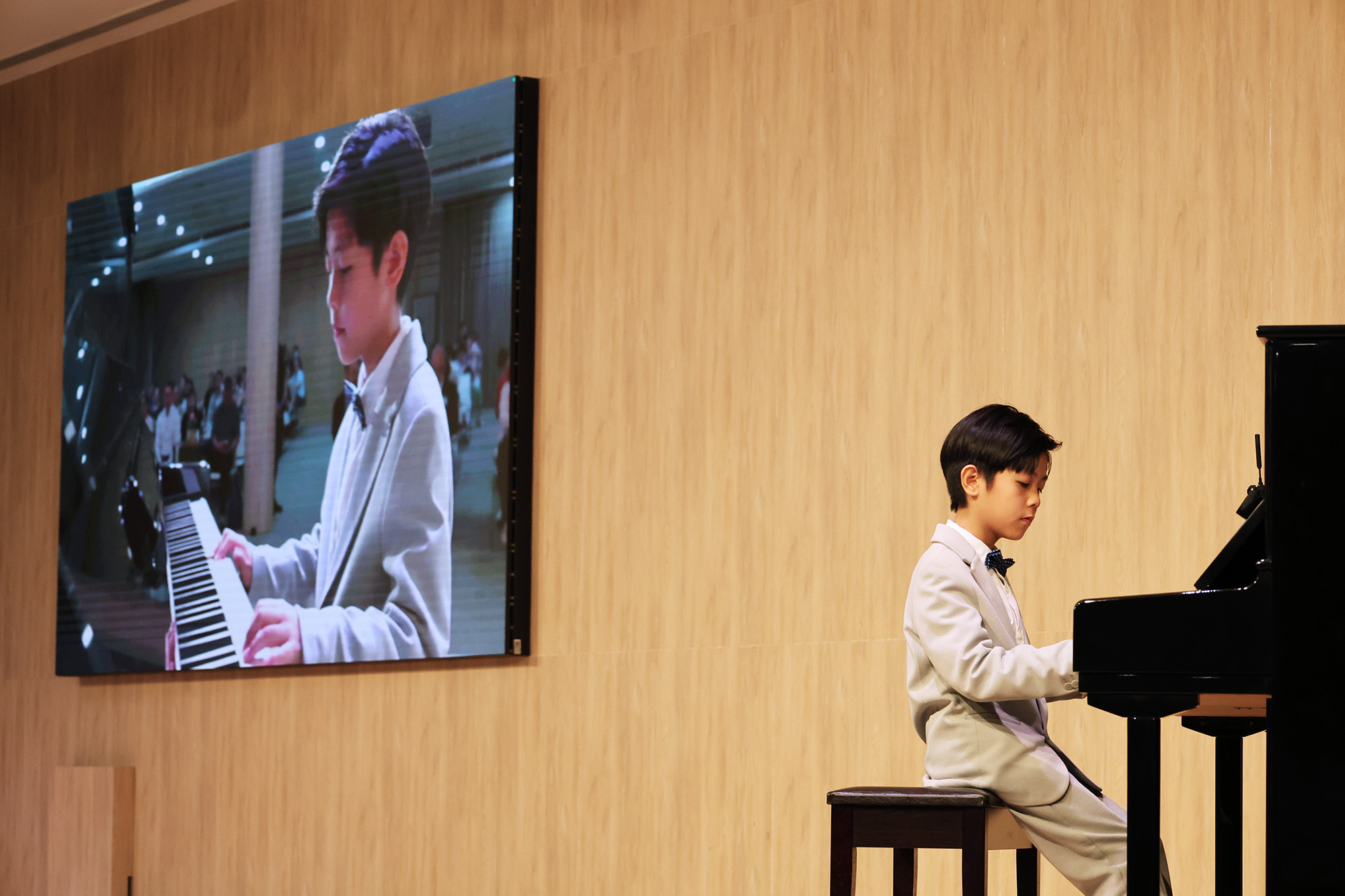 9岁的洪宇哲在爷爷洪振群的带领下在感恩会上演奏钢琴。