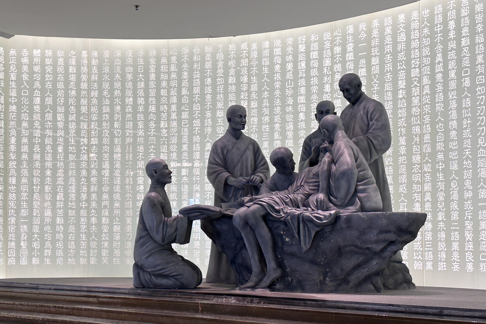 槟城慈济洗肾中心坐落在一间拥有约105 年历史的老屋内。进门所见是偌大的“佛陀问病”雕塑,周边墙上刻着《慈悲三昧水忏》经文。墙上的流水,比喻“法譬如水能洗垢秽”,见证了“洗肾、洗心”的行动力。